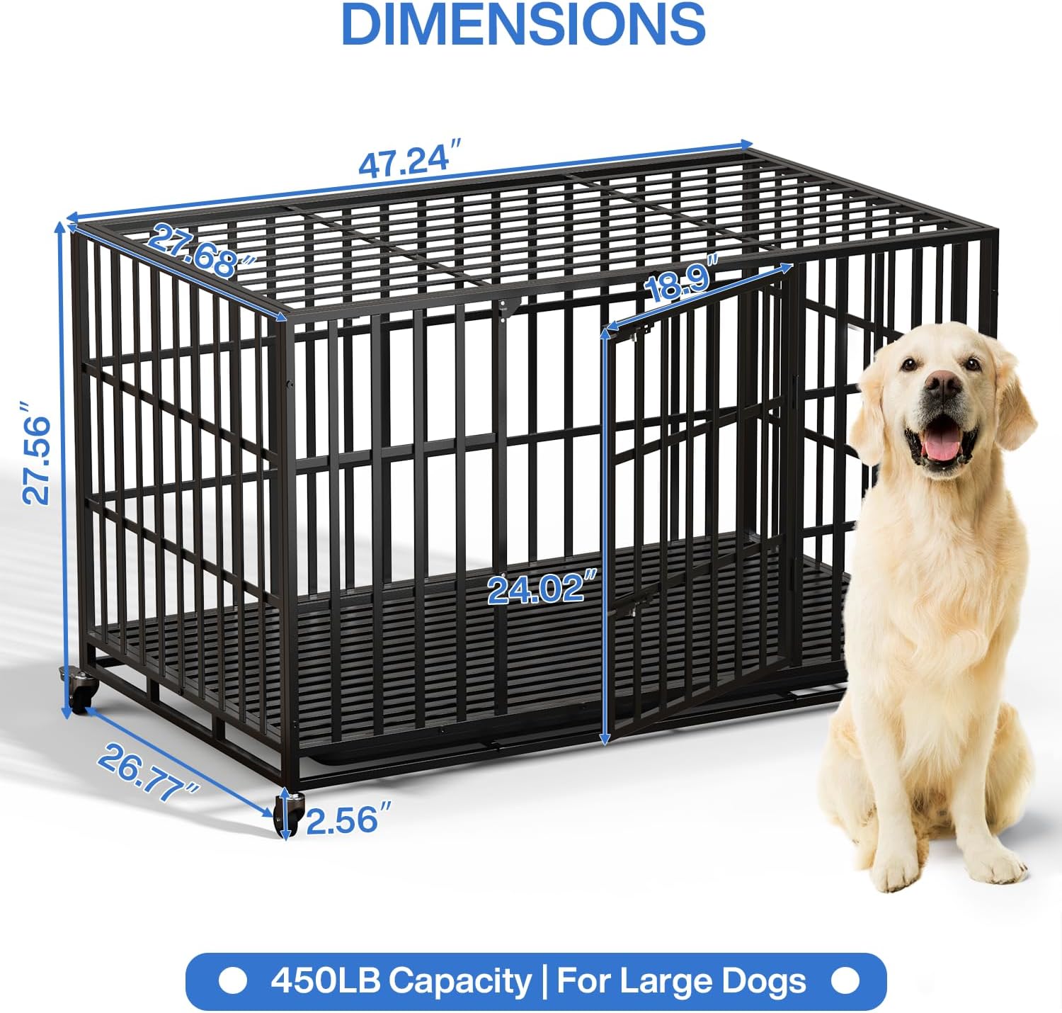 LEMBERI 48 Inch Heavy Duty Dog Crate, Indestructible Dog Kennel Indoor, Escape Proof Pet Cage for Large Dogs, High Anxiety Dog Crate with Double Door, Lockable Wheels & Removable Tray