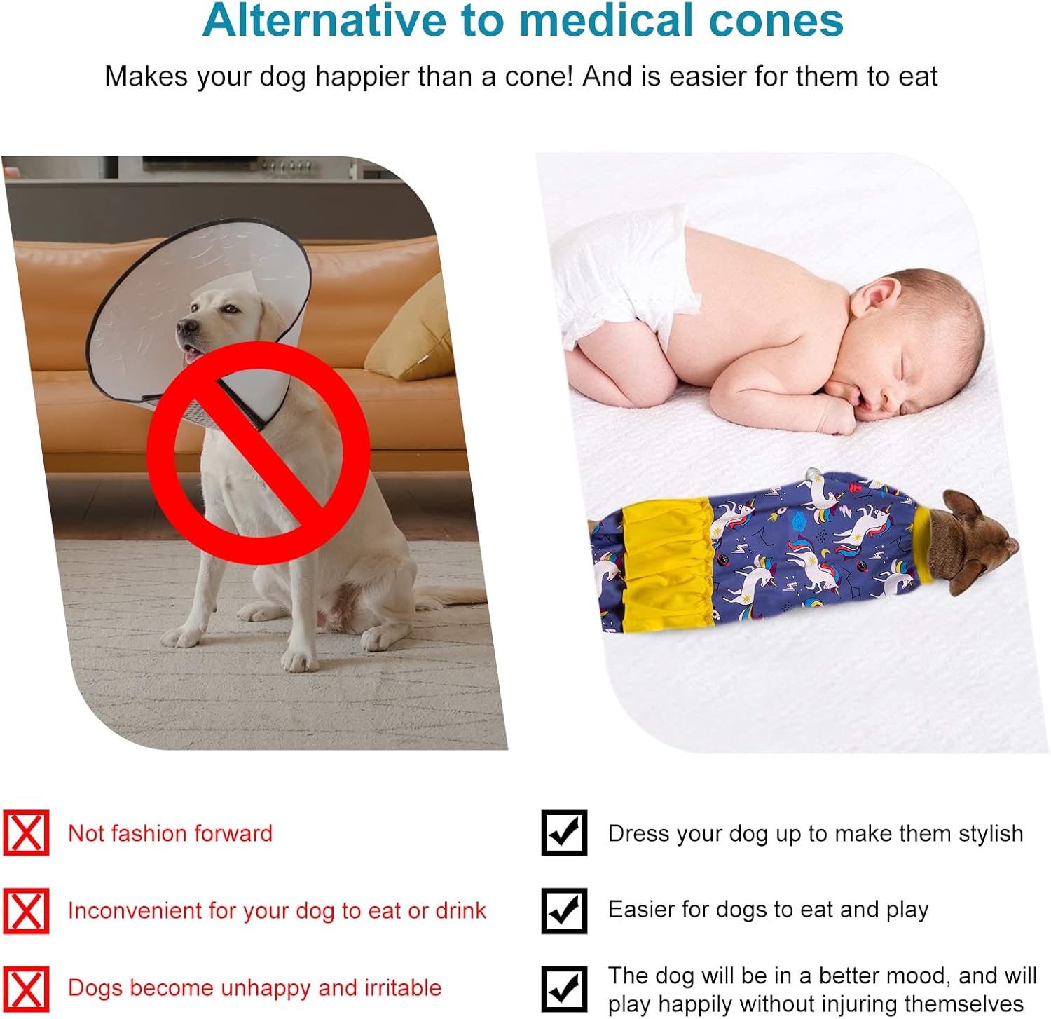 My dog was not doing well with the cone of shame–it was too short for her borzoi-style nose! I was at my wits end constantly watching her to ensure she didn’t pull out stitches. I ordered and tried out several kinds of cones and covers online–and I got sent this unicorn pattern by mistake. Not something I’d have chosen, but I was so tired and stressed out I just slapped it on my dog anyways after a leg-sleeve was taken off within mere seconds (She thought it was a fun game). Not only was this easy to put on my dog, left PLENTY to space for her to do her businesses, and absolutely worked and protected her stitches… But it also looked really cute as evidenced by the sheer amount of of people that talked about her and wanted to pet her when we went out. Did my dog like it? Nope. She walked like a crab everywhere confused by clothing being on her… but did her stitches get protected for 10 days in a row? Yup! She wore the cone at night when I’d sleep and these pajamas 24/7. During the day she could take the cone off and just wear the pajamas after they confused her too much to try biting at her stitches anymore. Top tier product, highly recommend for any dog owner trying to add an extra layer of protection… Or taking their dog to a pajama party.