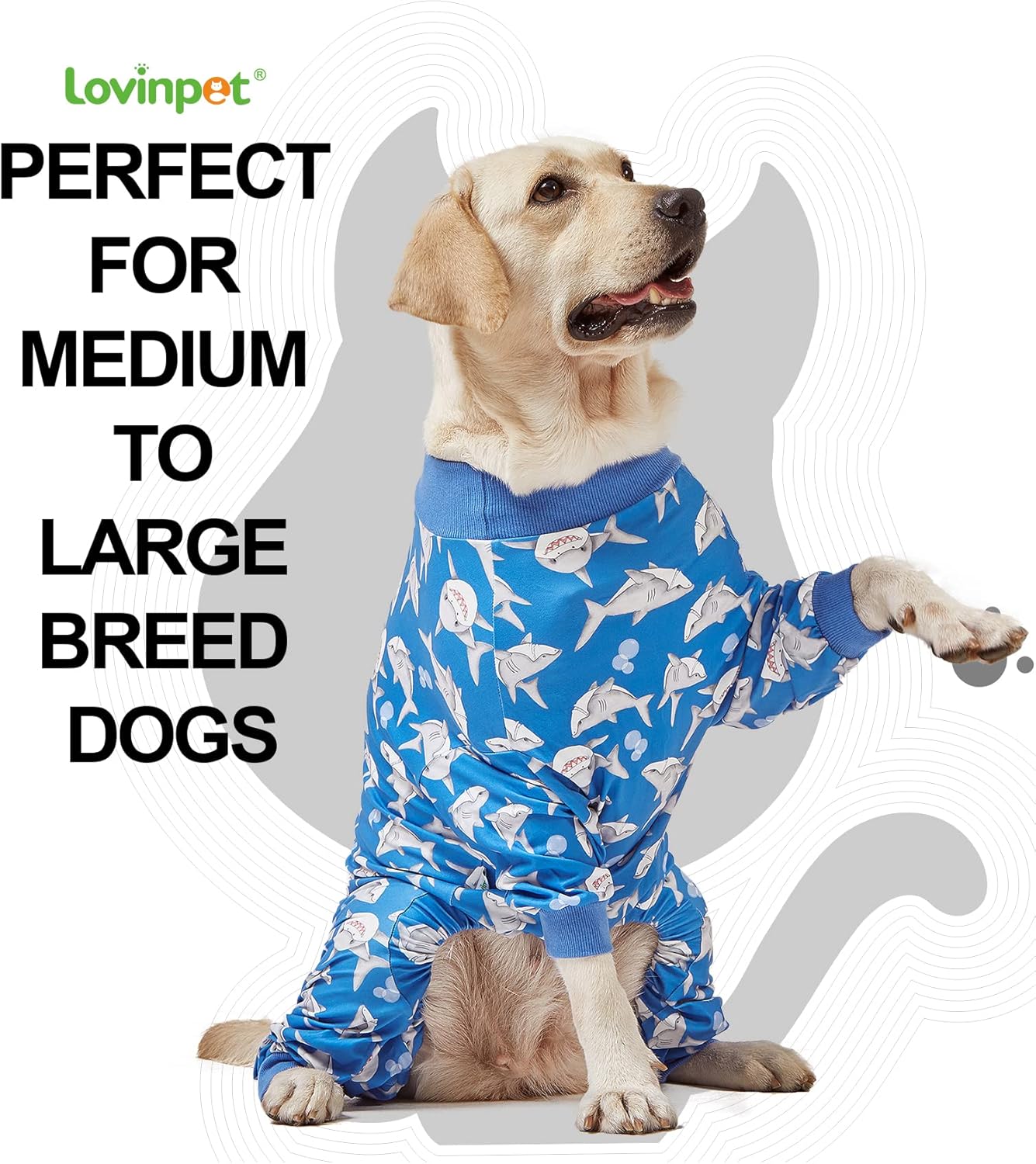 LovinPet Large Dog Pjs, UV Protection, Pet Anxiety Relief Onesies, Lightweight Stretchy, Blue Shark Print, Undershirt for Dog Sweaters and Coats, Large Breed Husky Pajamas, Pet PJ’s/Medium
