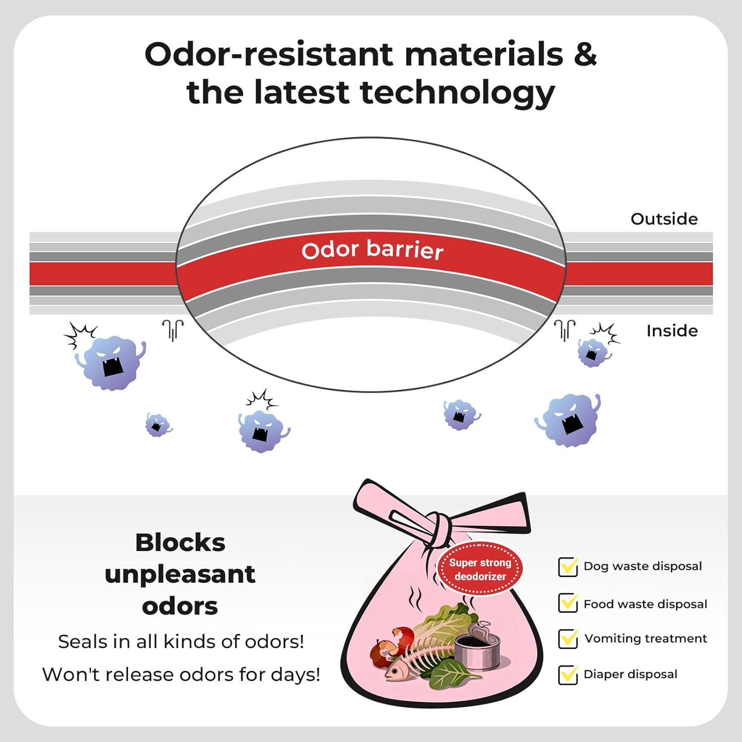 Powerful Odor Control: Designed for powerful odor sealing, these dog poop bags use special odor-blocking technology to completely conceal smells and mess for up to 3ā5 days. Theyāre also unscented dog poop bag, making them a great choice for pets and owners with sensitive noses