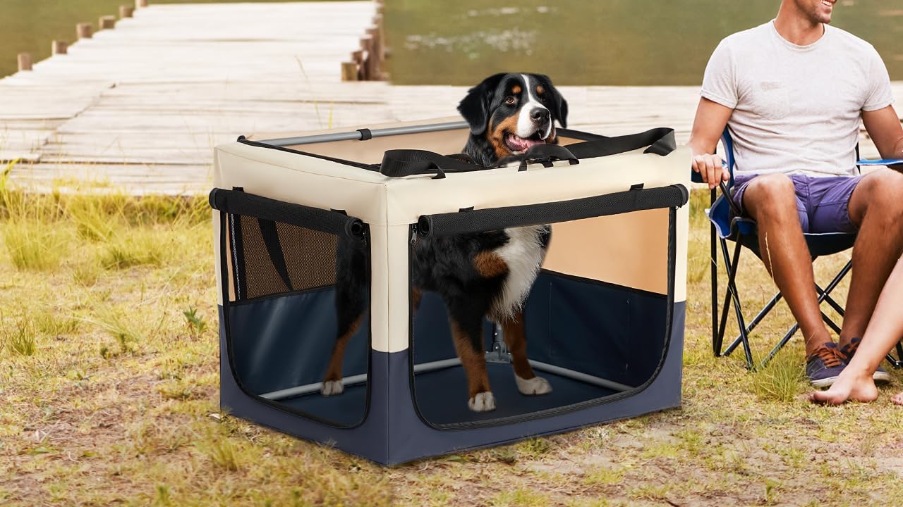 The Petsfit large collapsible dog crate is a great product with lots of front and side ventilation. However, while the Amazon Basics crate doesn’t have as much side ventilation, it is easier to set up.