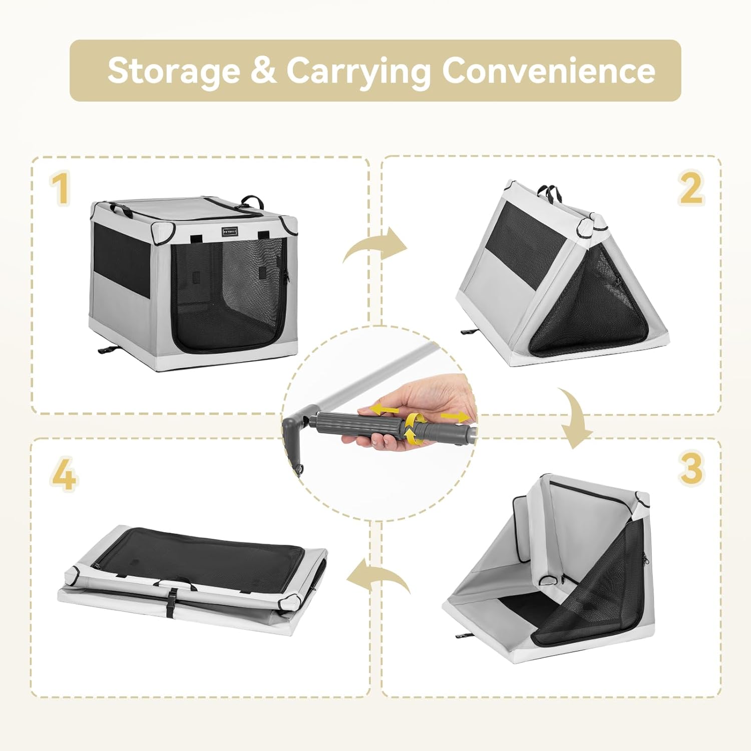 Our whole-pipe-support design will be more sturdy and safe, which will not collapse when the dog leaning over the pipe with feets. As long as the spiral tube is rotated down, the portable dog crate can be completely folded flat, and the handle on the top is convenient for you to carry when you go out.