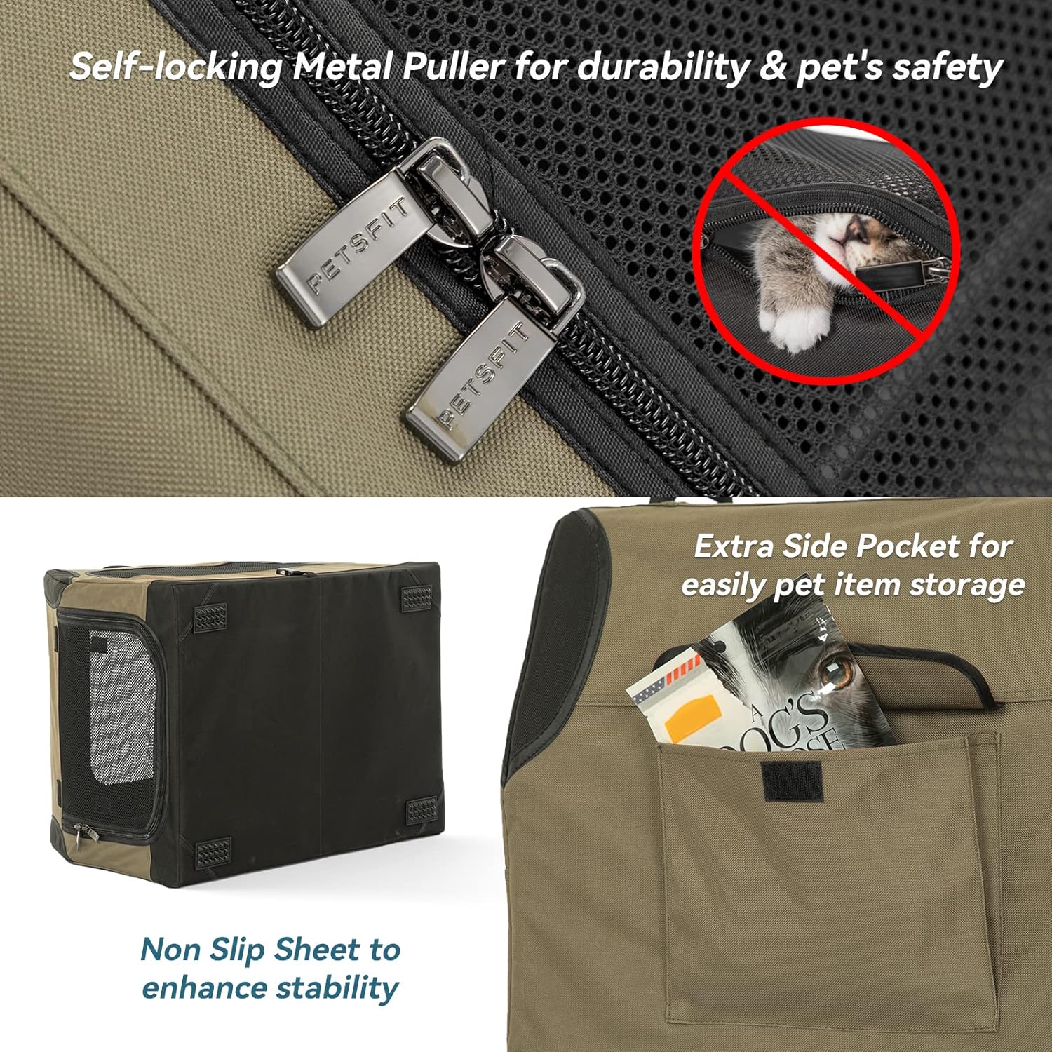 PETSFIT Travel Dog Crate, Soft Dog Crate – 24 Inch Sturdy Adjustable Structure, Easy to Set Up, Portable Dog Kennel for Car, Light Tough with 3 Mesh Doors, Army Green