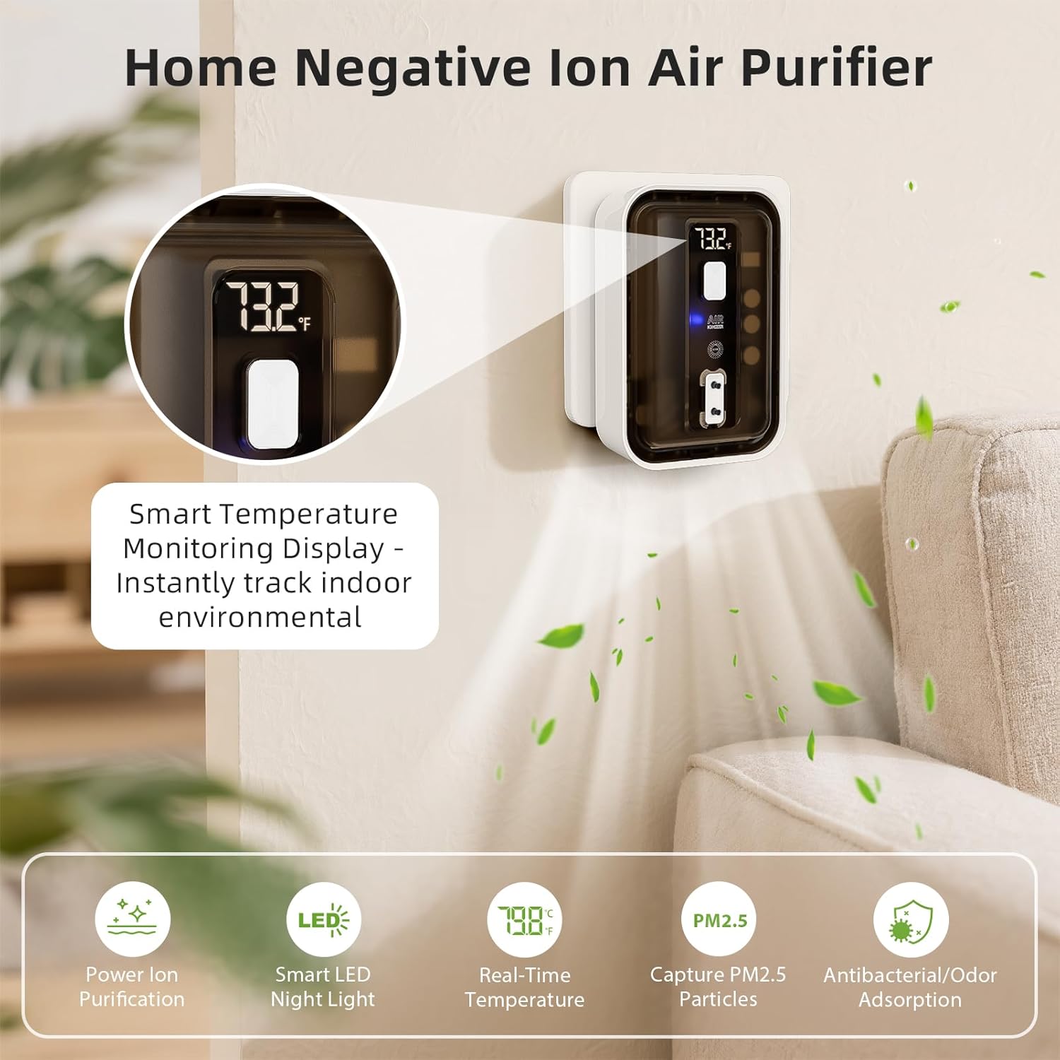 Smart LED Night Light + Temperature: The light-sensing LED night light provides soft illumination, while the real-time temperature display gives instant room updates. This compact plug in air purifier doubles as a bathroom air refresher and indoor cat comfort support, offering the same simplicity as plug-in air ionizers for home.