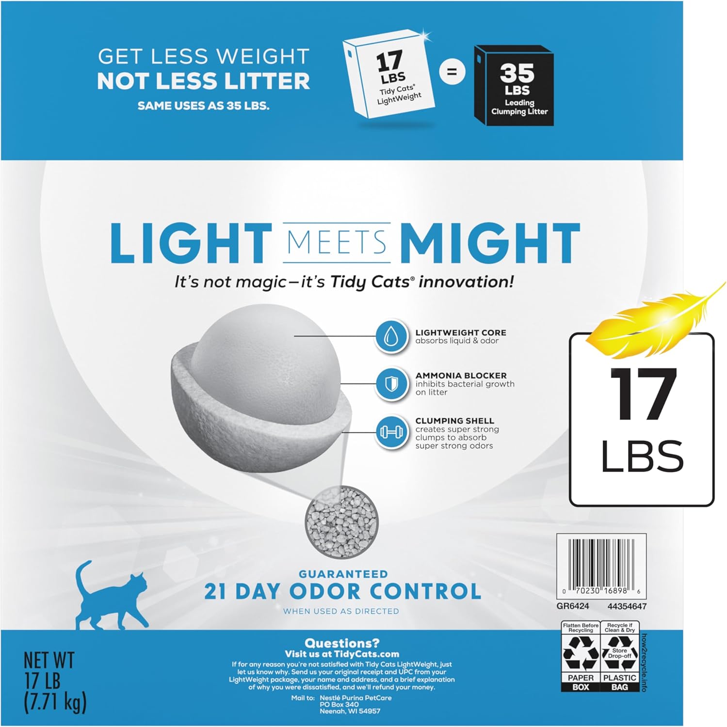 LIGHTER CAT LITTER: Tidy Cats cat litter lightweight formula is 50 percent lighter than the leading clumping litter–less weight, not less litter.