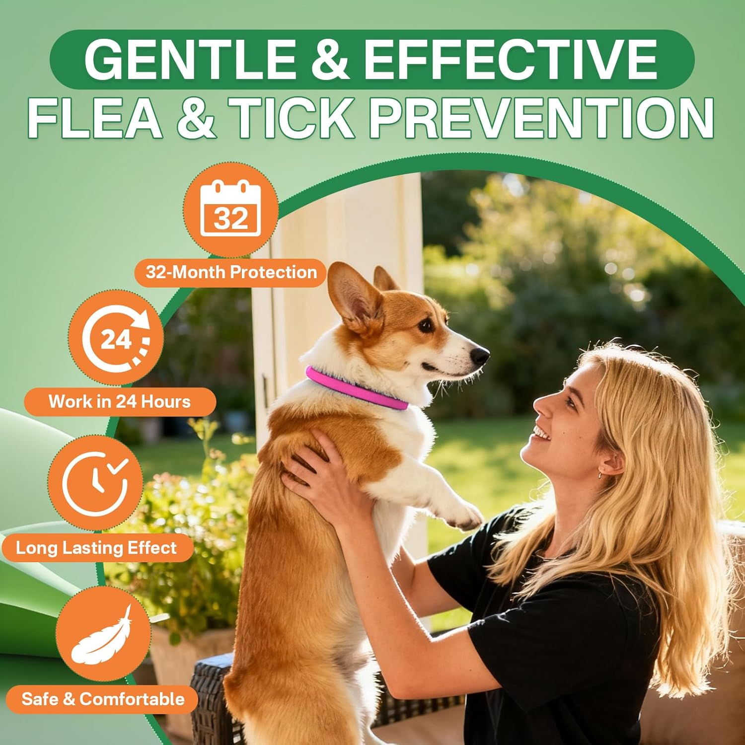 32-MONTH FULL-BODY PROTECTION: The flea treatment dog collar provides 8 months of flea defense, and four collars deliver a total of 32 months of continuous coverage. Using natural diffusion, the active ingredients spread from the neck through the fur and skin, forming a protective layer within 24 hours. This helps repel and control fleas and ticks, while reducing itching and recurring disturbances. No need for frequent replacement—saving time and effort and remaining friendly to both pets and owners.