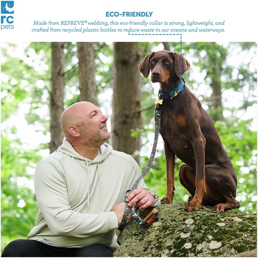 ECO-CONSCIOUS MATERIAL. Made from lightweight, durable webbing using REPREVE by Unifi, Inc., a recycled polyester sourced from plastic bottles. This collar helps reduce environmental waste without sacrificing performance or strength.