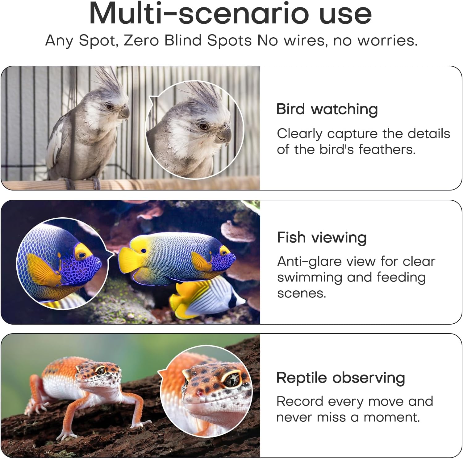 CRYSTAL-CLEAR VIEW THROUGH GLASS – High anti-reflective lens coating and optimized mounting angle eliminate distracting reflections when attached directly to aquarium or terrarium glasses —so you see your pets clearly, not your own reflection