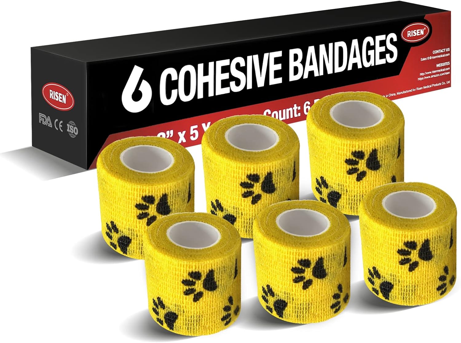 Risen Self Adhesive Bandage Wrap 6 Pack,2”x 5 Yards Medical Tape for Christmas Gifts,Gauze Rolls First Aid Vet Wrap Adherent Bandages for Sports,Dogs(Yellow Paw)
