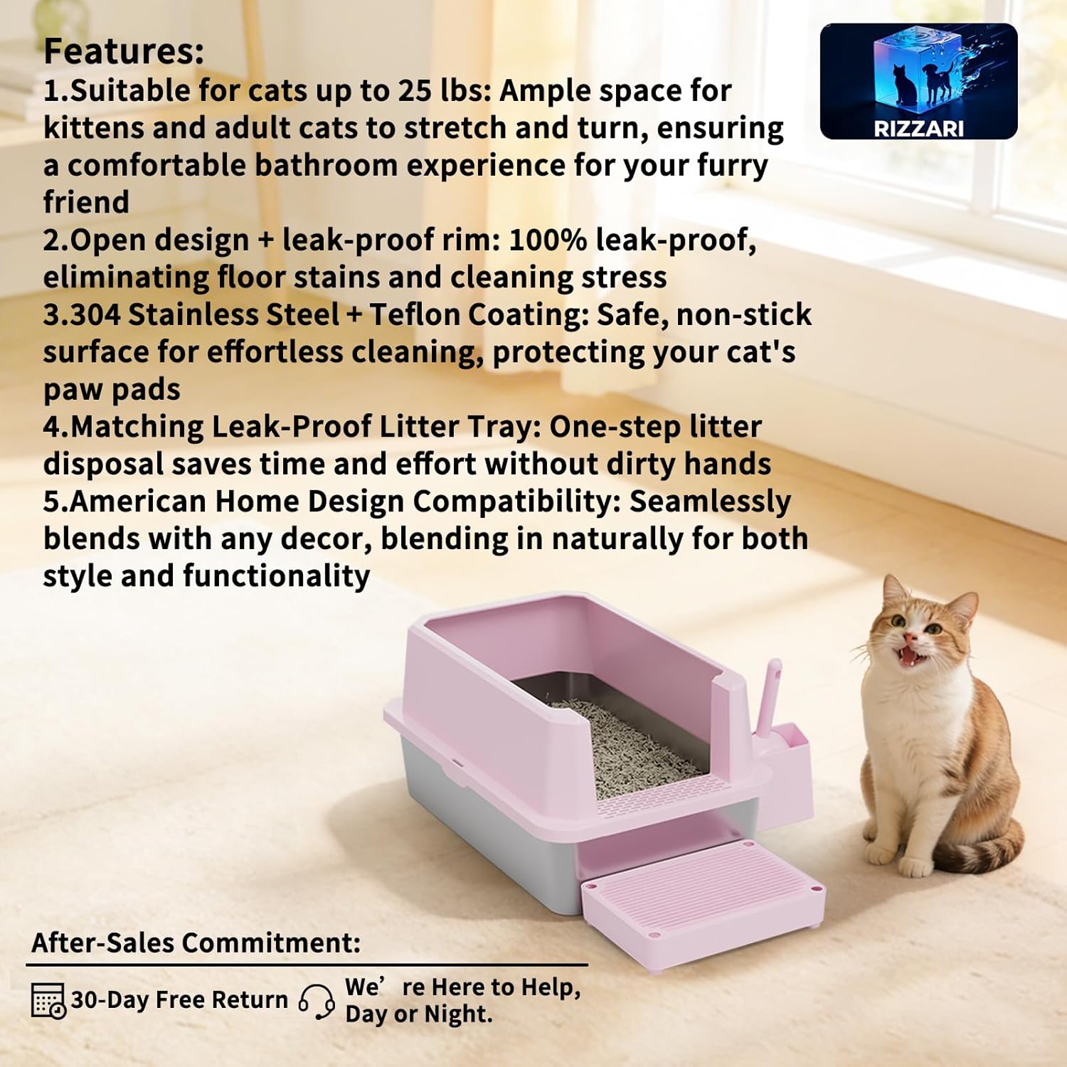 RIZZARI Large Cat Litter Box: Pink Semi-Closed Stainless Steel Litter Box with High Edges – Teflon Non-Stick Coating – Odorless Litter Pan Anti Leakage for Small to Large Cats for Bedroom Living Room