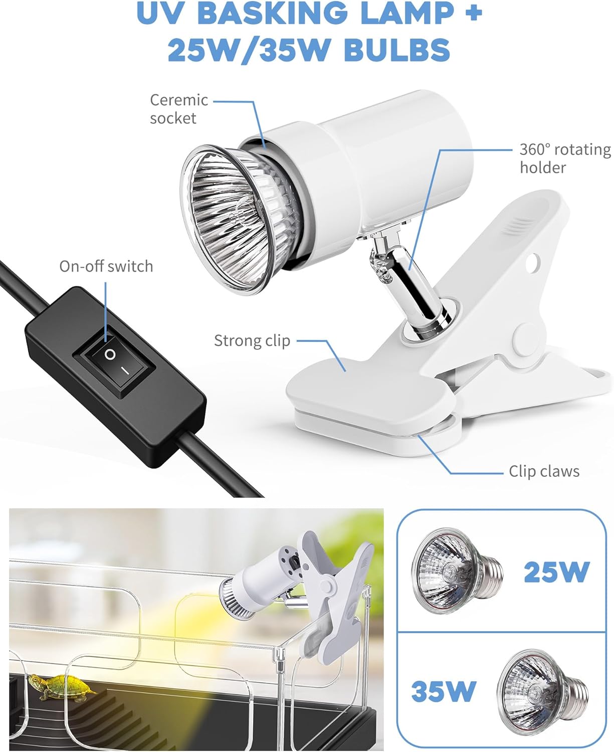 【UVA/UVB Basking Lamp + 25W/35W Bulbs】Turtles need to bask in the sunshine everyday 1-2 hours for metabolism, mood regulation, breeding, etc. 25W/35W Bulbs provide best warmth within distance of 10’’ to 15’’. They’re perfect for this small tank, not too hot not too cold.