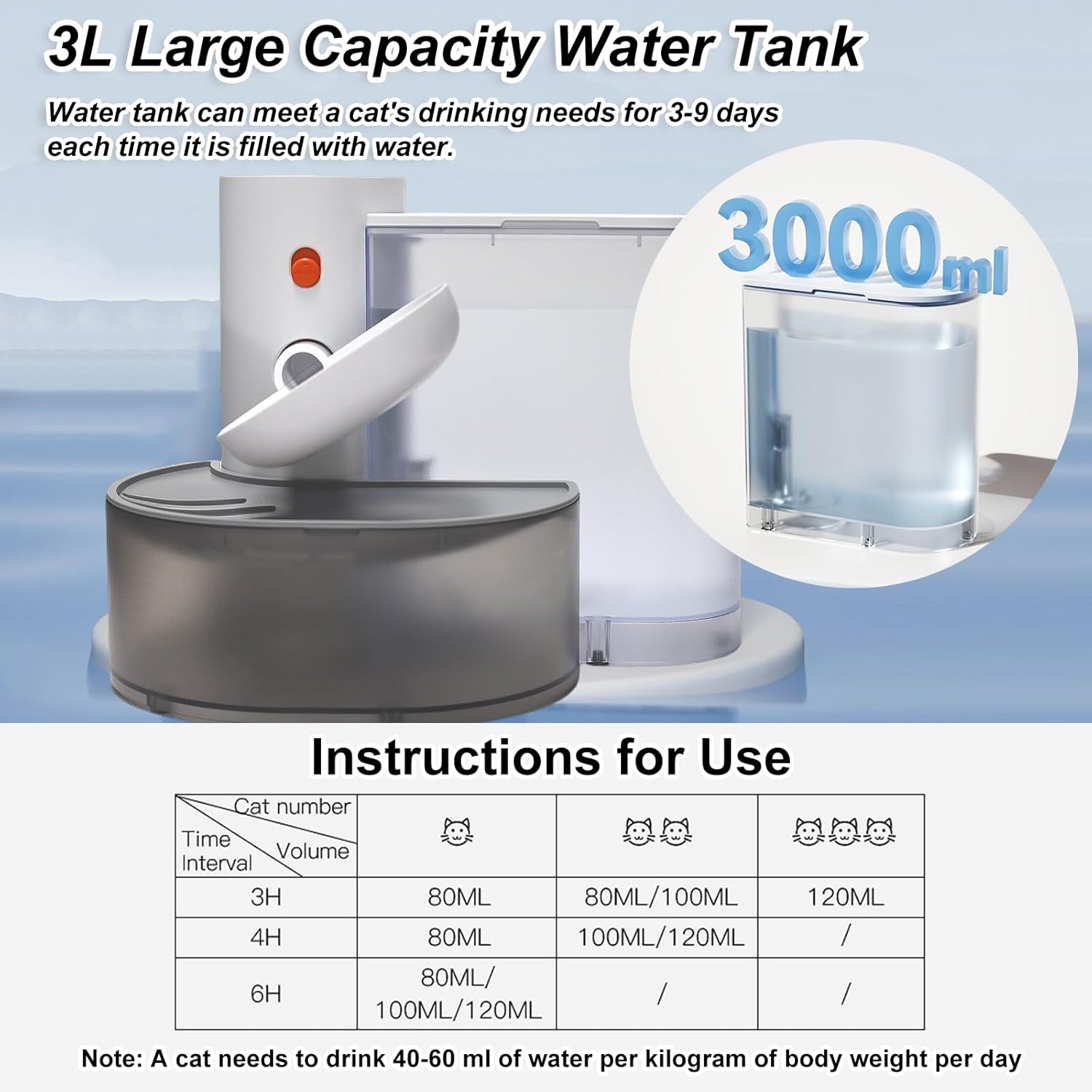 Extra Large Capacity: This automatic cat water fountain can hold 101.5oz/3L of water, depending on the frequency of water changes and the amount of water, each time the water tank is filled it can satisfy the cat’s drinking needs for 3-9 days, suitable for taking it on short trips.