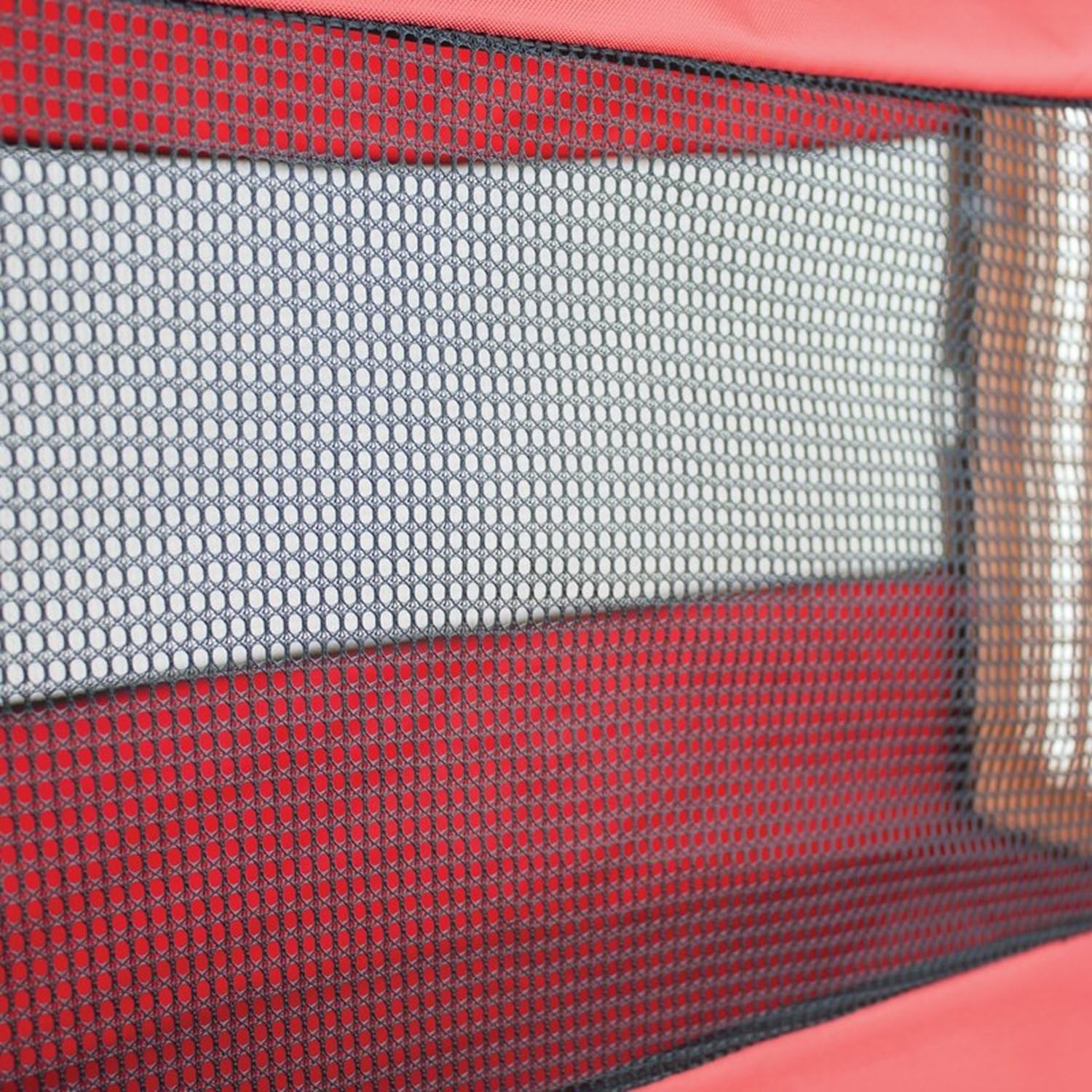 I love that it is light weight and I really love the door. It is like a standard crate and has a latch and a swinging door. The door, the weight and good air flow are my favorite features. It is easy to get your dog in and out. The height and length are good but it is a little narrower than a standard sized 36″ crate. However, my dog is very comfortable in crates and is fine with it. He just lies down on the side if he wants more side to side space. It pushes the side out and pulls the ends in a little but it doesn’t bother him. When he stands up, it pops back in to proper shape. The vent screens on each side and the back seem to let quite a bit of air flow through and the front gate lets a lot of air flow through. I would not use the Large sized crate for a long period of time for my 40 – 45 lb Aussies because it doesn’t have quite enough width but it is perfect for my Agility lessons.