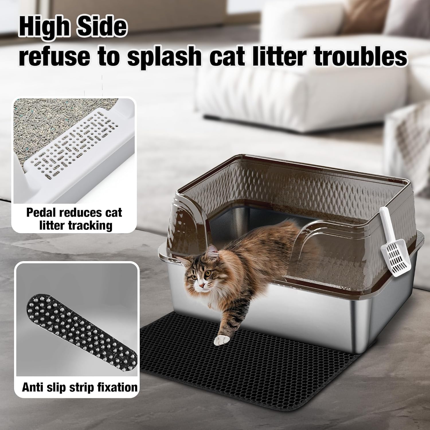 Suhaco Extra Large Stainless Steel Litter Box with Lid XXL High Sided Cat Litter Boxes Included Litter Mat & Litter Scoop Anti-Urine Leakage Metal Pet Toilet for Big Cats (Black XXL)