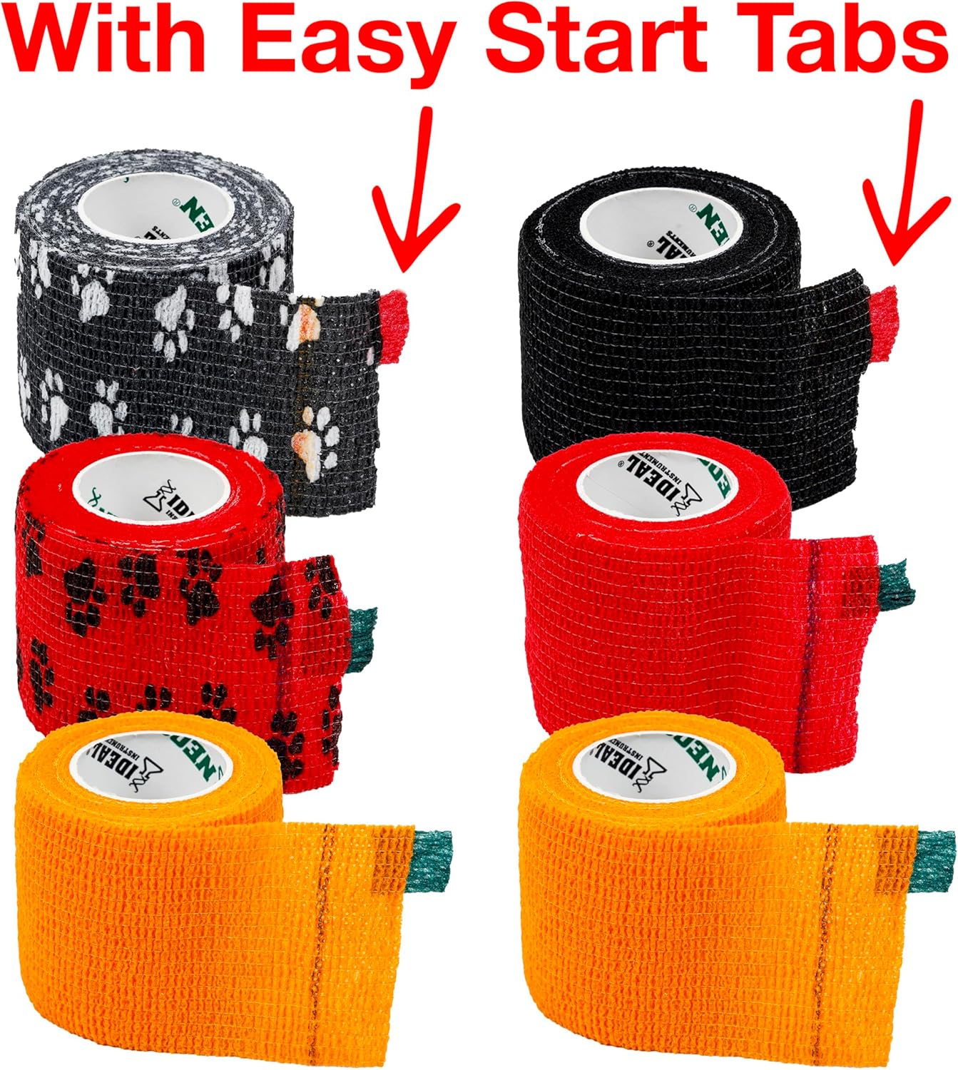 Ideal Cohesive Bandage wraps are durable, self-adhering bandages that come in multiple sizes and can be used in a variety of different situations. The bandages include an Easy-Start tab and a colored starting line, making them quick and easy to unroll. The strong elastic can be torn without the use of scissors for ease of use. They are also water resistant to prevent the holding of moisture, as well as slip-resistant, making sure the bandage stays in place. Adheres to itself (not hair). Controlled compression provides even support and security without constricting, while still remaining breathable. Contains natural rubber latex.
