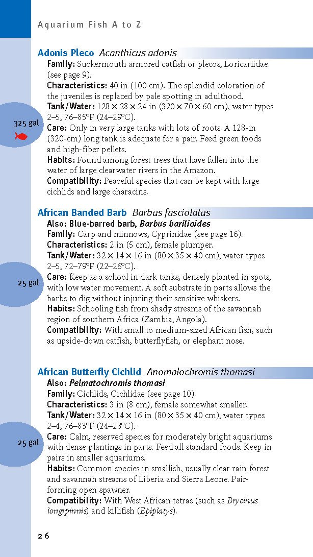 Book is small (length & width). But, it is has about 250 pages of useful information. For each fish that is discussed, there is a nice, close-up, color photo. Plus the scientific name, the common household name, characteristics (very brief), is given. Also, the author provides a few sentences covering: Care, Habits, and Compatibility for each fish. Plus, the “recommended tank size” is given, which often seems too large in my opinion. This is a very good reference book if you are trying to figure out what type of fish you have, or if you want to check the compatibility of specific fish. The print is small, but it is clear and sharp because of the high quality paper. For the price, this was a good purchase.