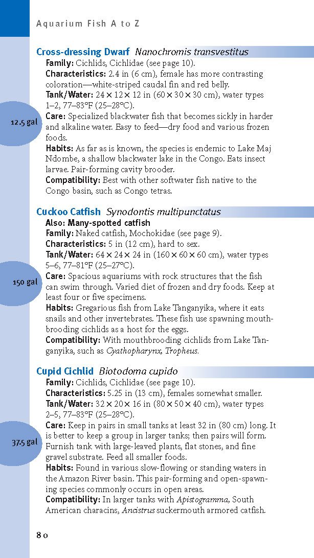 As someone new to the hobby, this book helped me tremendously in selecting not only what fish I could and should put in my new fish tank, but helpful tips as to how I should care for them (Ph levels, water temps, compatible types, etc.). I reviewed this book and read “The Essential Freshwater Aquarium” guide; both books help ensure that my first try as an aquarist results in a healthy environment for my fish. I was so impressed by the A to Z Guide that I bought one for a friend who has kept fish for over a year but was mixing fish indiscriminately without regard to the size of her tank or the type of fish already in the tank. We both now have a high enthusiasm for our aquariums and consult the guide before any new fish purchase. Highly recommended for new and experienced aquarists.