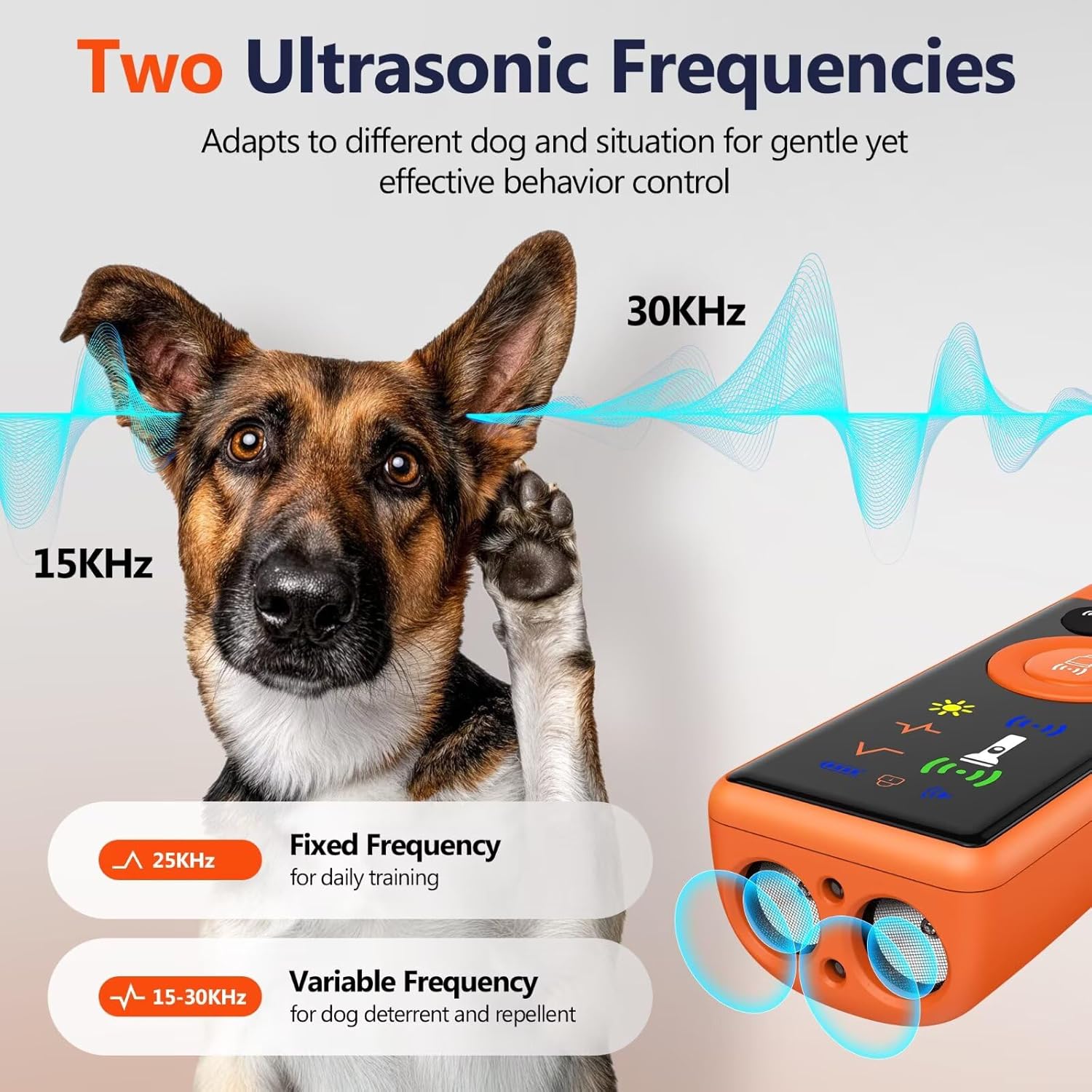 ♥Dual-Emitter Ultrasonic Technology♥: Designed specifically for dogs with varying temperaments and behaviors, this ultrasonic dog training device features two frequency modes—25kHz fixed mode for consistent correction and 15kHz-30kHz variable frequency mode for personalized training. The dual-emitter design provides a wider ultrasonic range of up to 16.4ft-35ft, making the ultrasonic dog repeller ideal for both indoor and outdoor use.