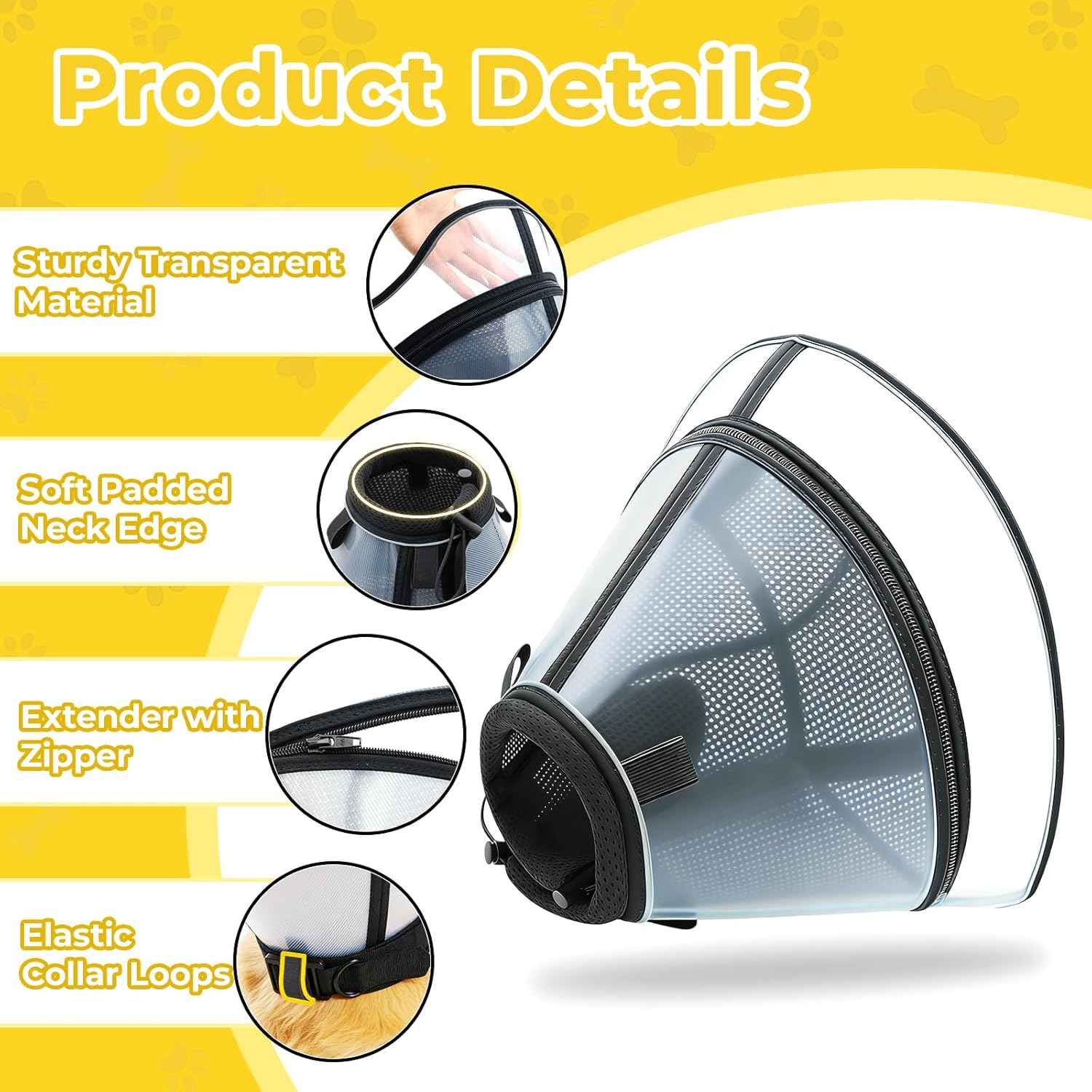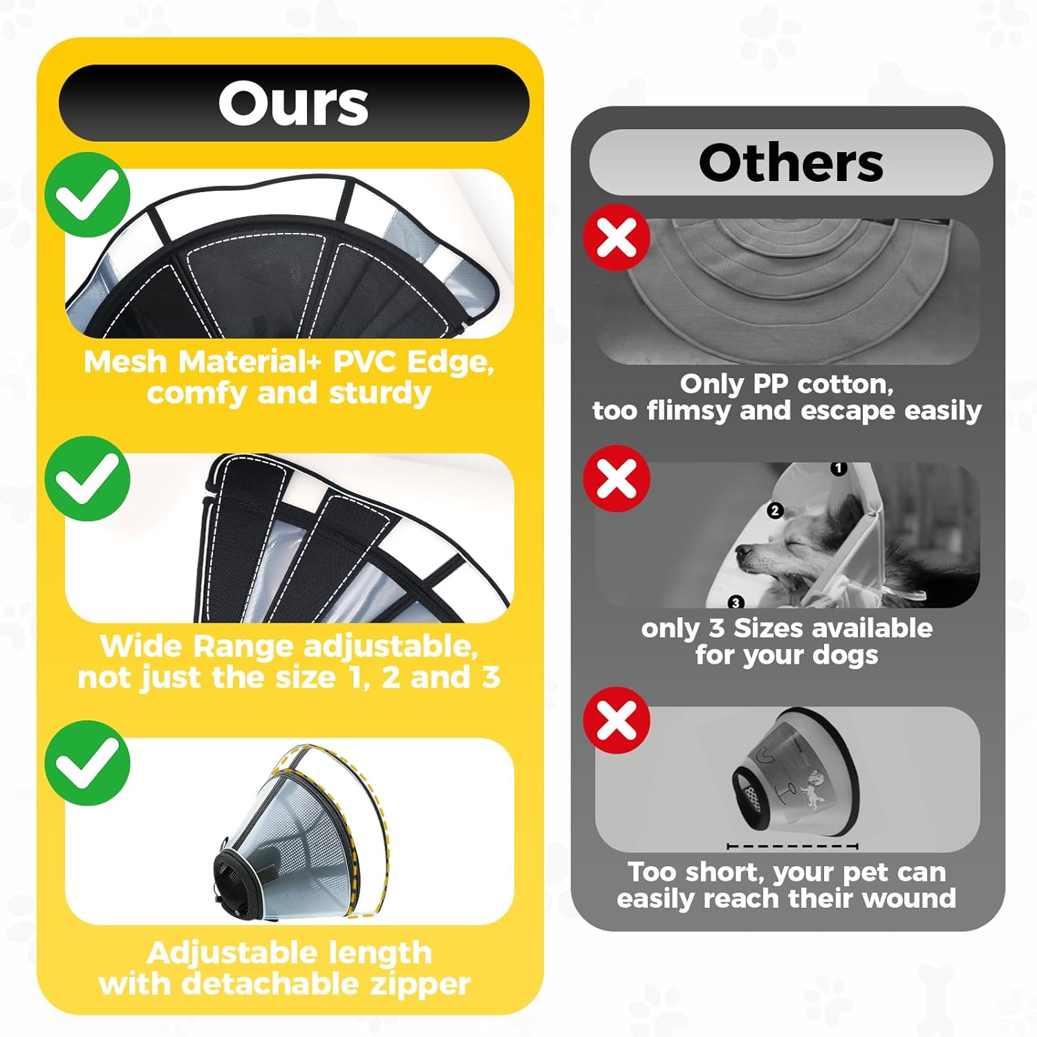 Warm Reminder: ā‘ Please make sure your pet’s neck size and length of the pet’s head before purchasing (note: please make sure your dog’s head is not longer than the product’s depth). ā‘” To preserve the elizabethan collar’ shape after unpacking, unfold and lay it flat to allow it to relax. ā‘¢ Always supervise your pet while they’re wearing the dog surgery cone, as they may try to chew on it if left unattended. If your dog tries to chew the zipper or e collar, redirect their attention with treats or toys. ā‘£Do not forcefully pulling on the zipper.