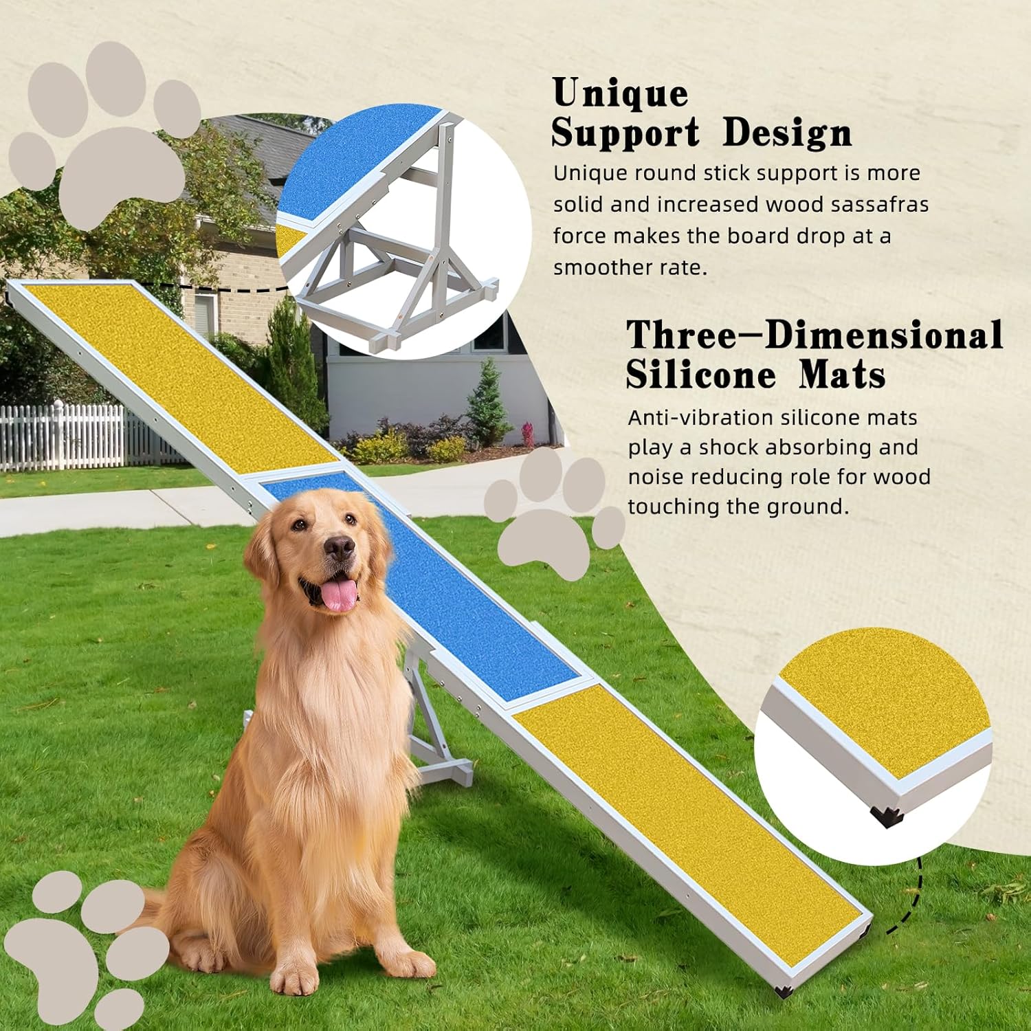 Sturdy & Durable Agility Seesaw: High-density wood with anti-slip, waterproof, sun-resistant surface ensures outdoor durability. Silicone pads reduce noise and provide cushioning for a comfortable training experience, perfect for any dog playground