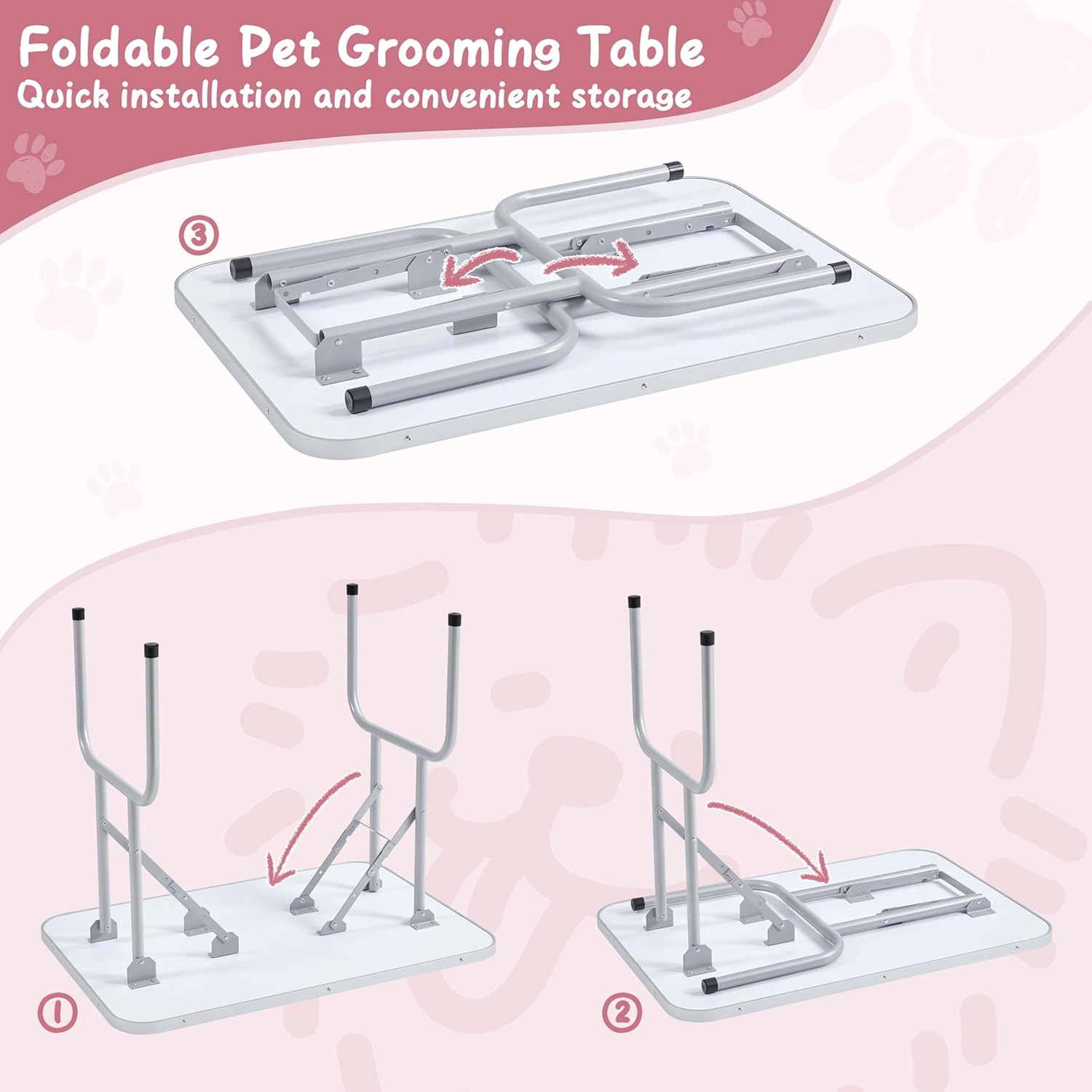 Retractable Table Legs: The foldable pet grooming table with noose features retractable legs that fold neatly toward the center, making it easy to store, transport, and organize without occupying extra space. Ideal for compact living and mobile use
