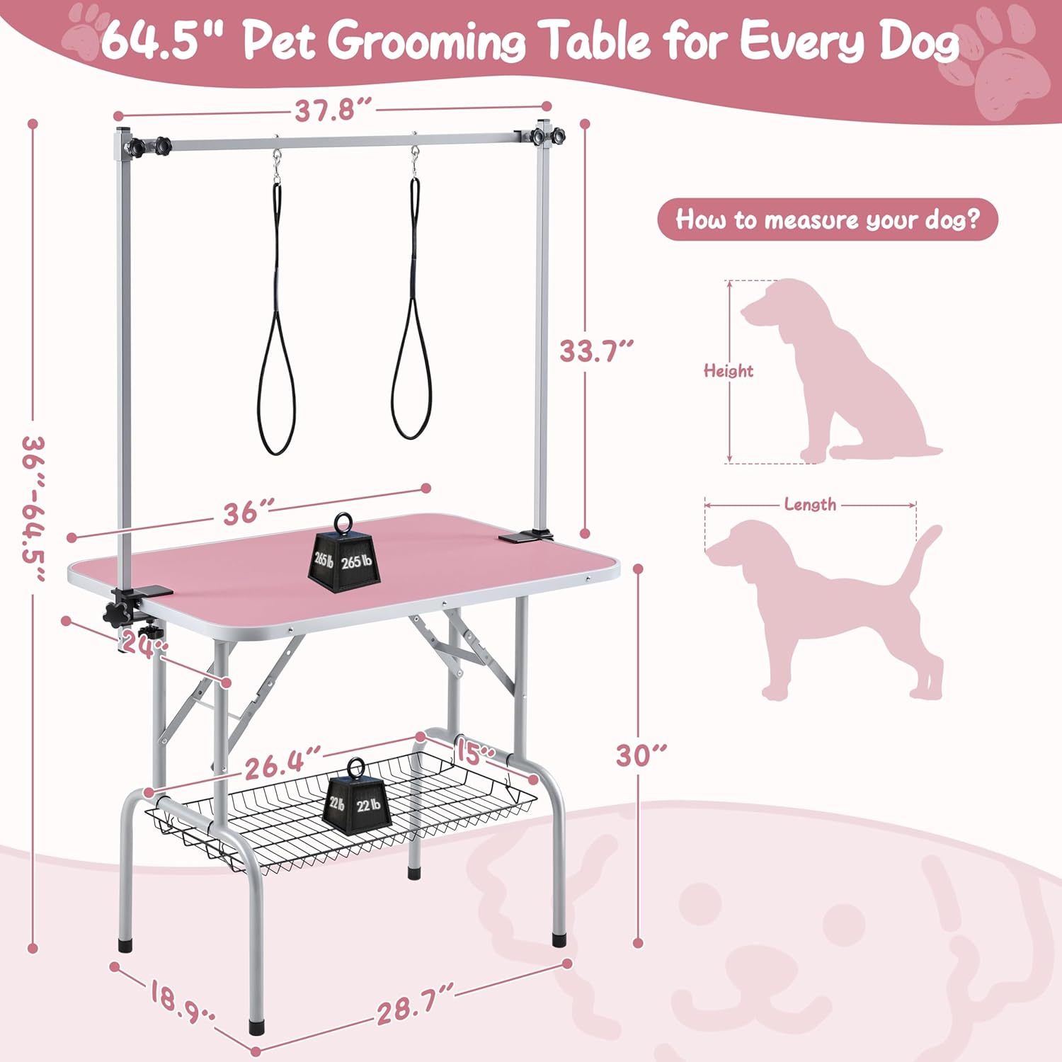 Yaheetech 36” Pet Grooming Table for Dogs Adjustable Height Portable Trimming Table Drying Table w/Arm/Noose/Mesh Tray Maximum Capacity Up to 265Lb, Pink